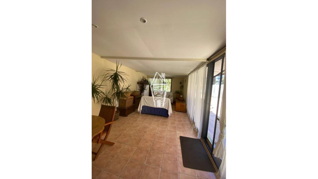 La casa principal es espaciosa y luminosa, distribuida en dos plantas. En la planta baja, hay un amplio salón-comedor con techos de madera y chimenea creando un ambiente cálido y acogedor. La cocina es independiente, totalmente equipada y su vez tiene un salón de celebraciones, ideal para cumpleaños y eventos familiares. Además, en esta planta se encuentran cuatro dormitorios con armarios empotrados, un baño con lavabo doble y ducha, y un baño adicional con ducha. Un solárium con vistas panorámicas y un dormitorio adicional, actualmente utilizado como oficina, completan esta planta.