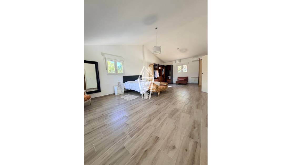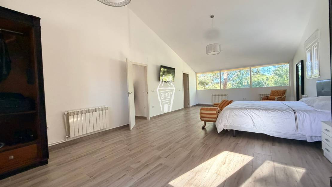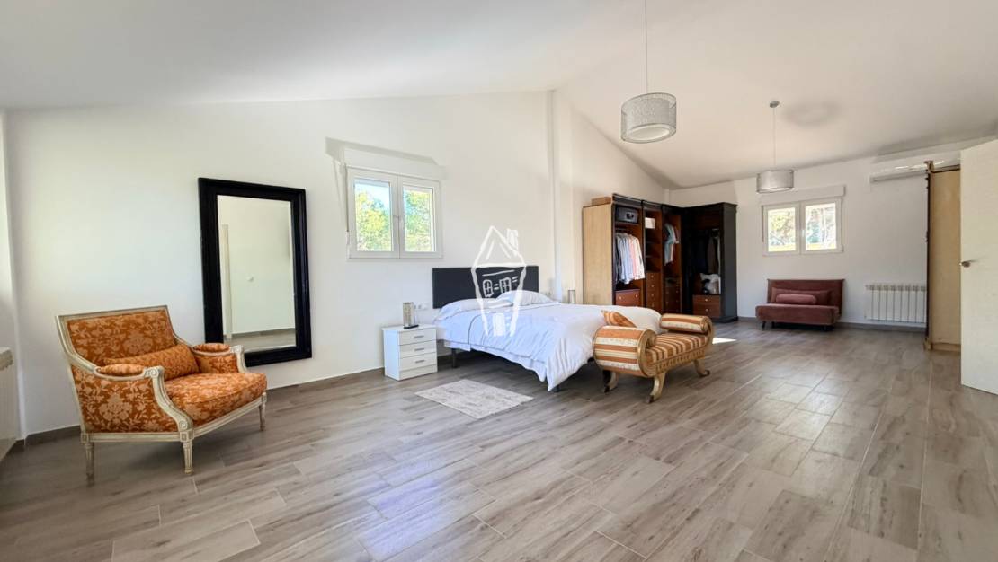 La planta primera dispone de un segundo salón-comedor con impresionantes vistas al bosque y a la finca, tres dormitorios y dos baños. El dormitorio principal, de grandes proporciones, ofrece zona vestidor y baño en suite, creando un espacio íntimo y exclusivo.